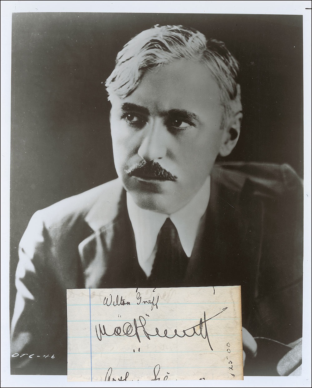 Vintage fountain pen signature, “Mack Sennett,” on an off-white 4.25 x 2.25 lightly-lined slip clipped from a larger page. Slip is affixed to the bottom portion of an unsigned glossy 8 x 10 photo. Toning and an ink notation to right edge, light show-through from writing on reverse, and a few stray ink marks and other signatures, otherwise fine condition. Pre-certified PSA/DNA and RR Auction COA.