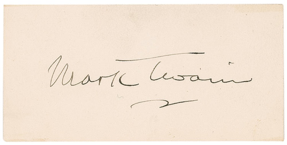 Fantastic ink signature, “Mark Twain,” on a white 3 x 1.5 card. In fine condition, with light toning and mounting remnants on reverse. Pre-certified PSA/DNA and RR Auction COA.