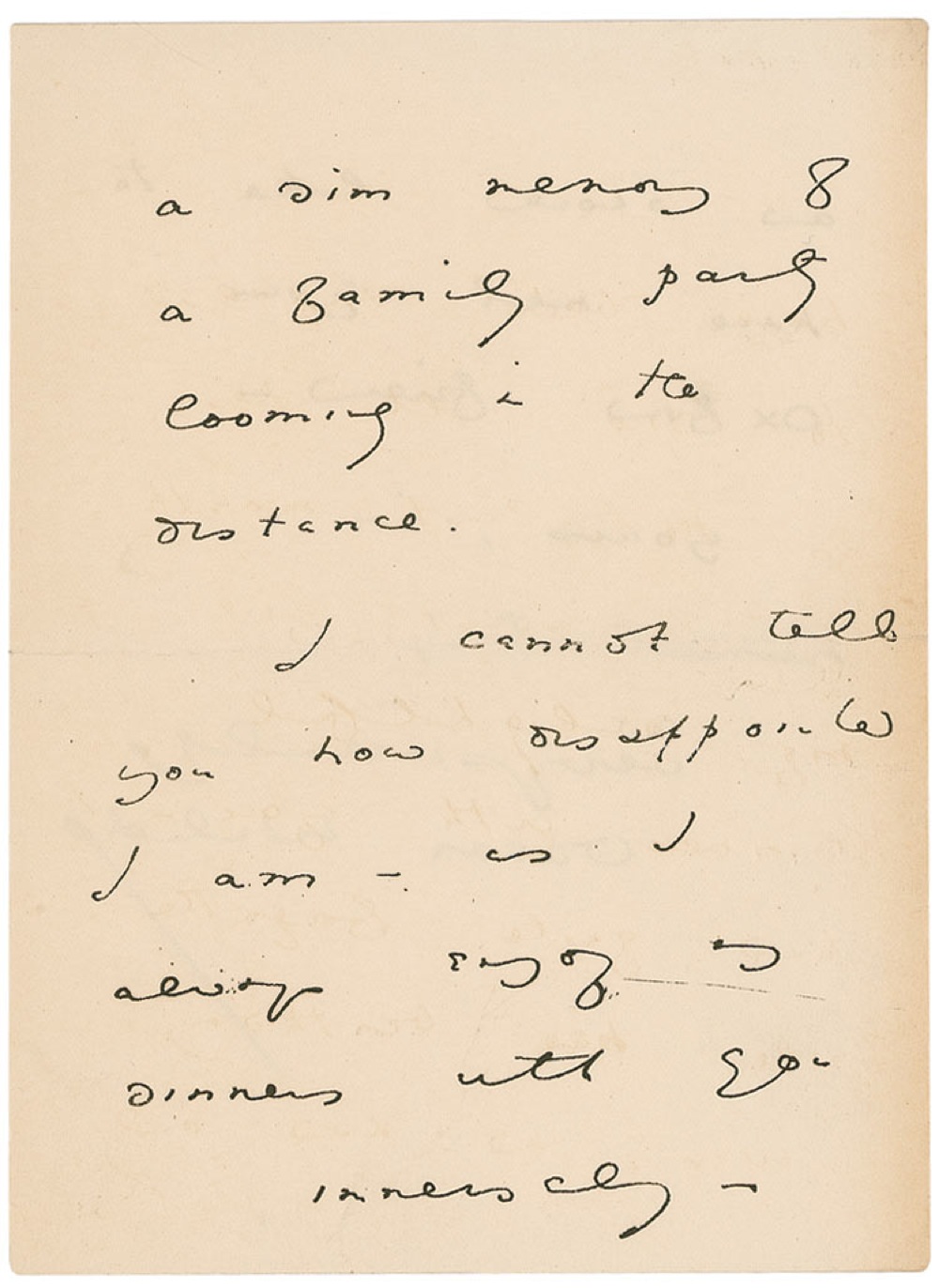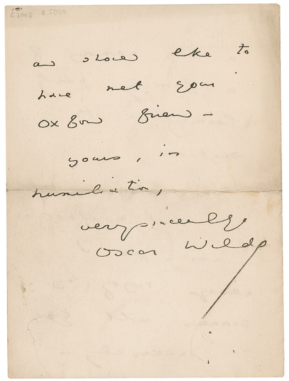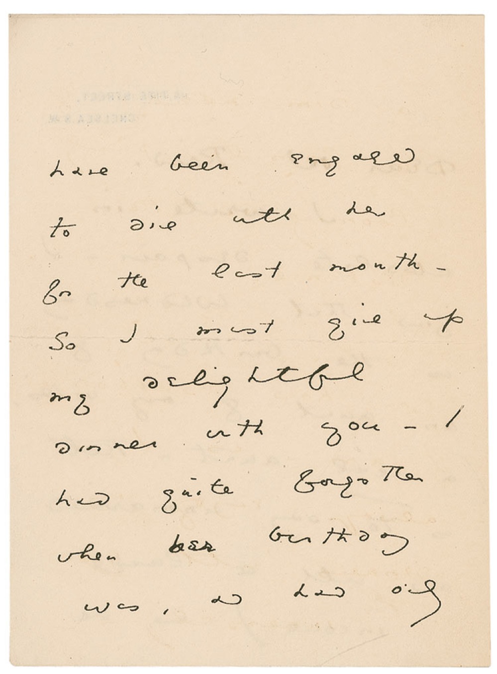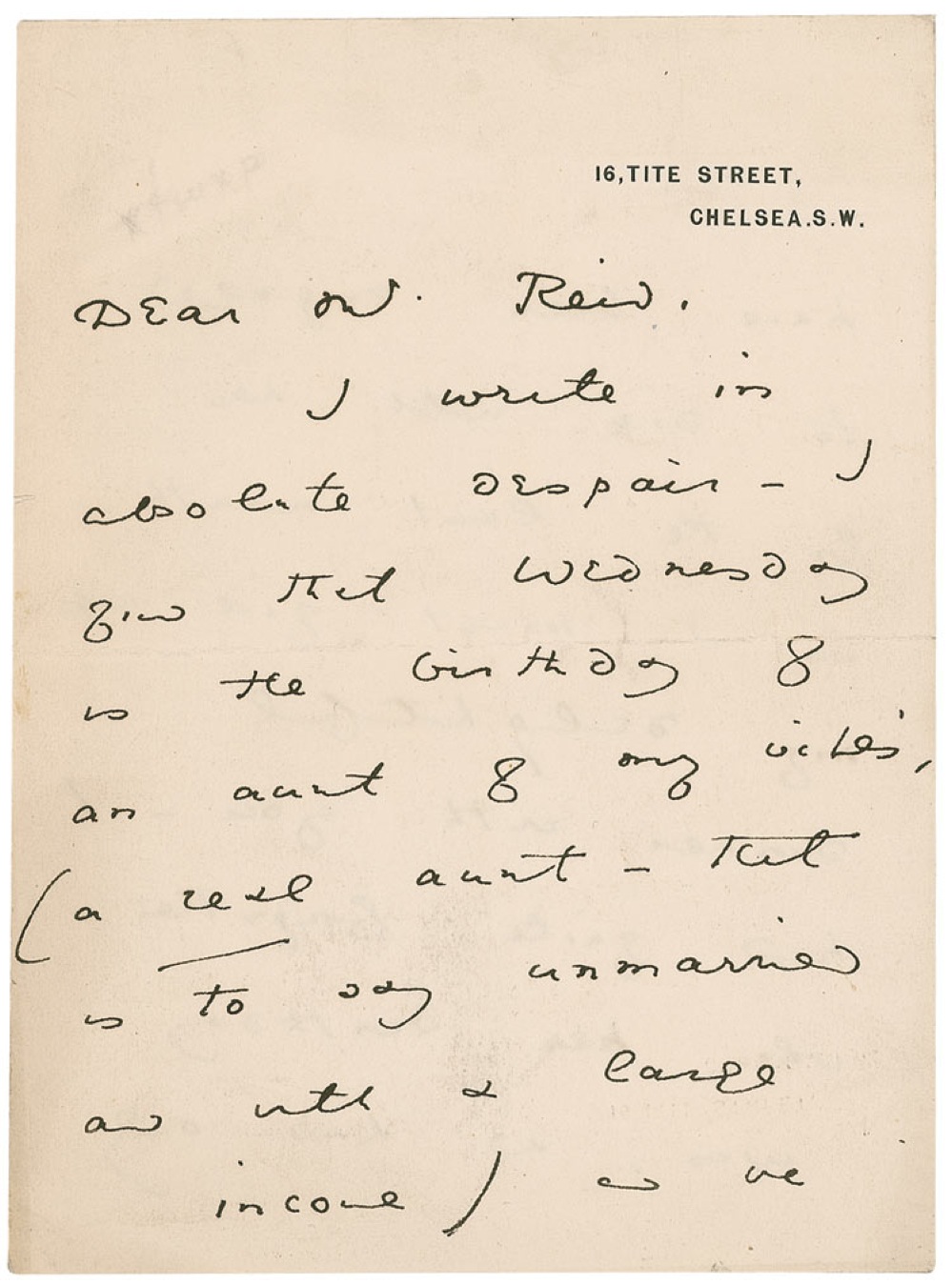 Colorful ALS, four pages on two adjoining sheets, 5 x 6.5, 16, Tite Street, Chelsea, S. W. letterhead, no date. Wilde regretfully cancels dinners plans with his friend, Mr. Reid, in full: “I write in absolute despair—I find that Wednesday is the birthday of an aunt...(a real aunt—that is to say unmarried and with a large income) as we had been engaged to dine with her for the last month—So I must give up my delightful dinner with you—I had quite forgotten when her birthday was, and had only a dim memory of a family party looming in the distance. I cannot tell you how disappointed I am—as I always enjoy my dinners with you immensely—and should like to have met your Oxford friend. Yours in humiliation.” Uniform toning, heavier along the right edge of the second integral page, some scattered light staining and rubbing, and a mild separation at the bottom of the hinge, otherwise fine condition. Wilde’s witty remark bears semblance to his beloved character Aunt Cecily from his acclaimed play, The Importance of Being Earnest, which, incidentally, would be his last play. Pre-certified John Reznikoff/PSA/DNA and RR Auction COA.