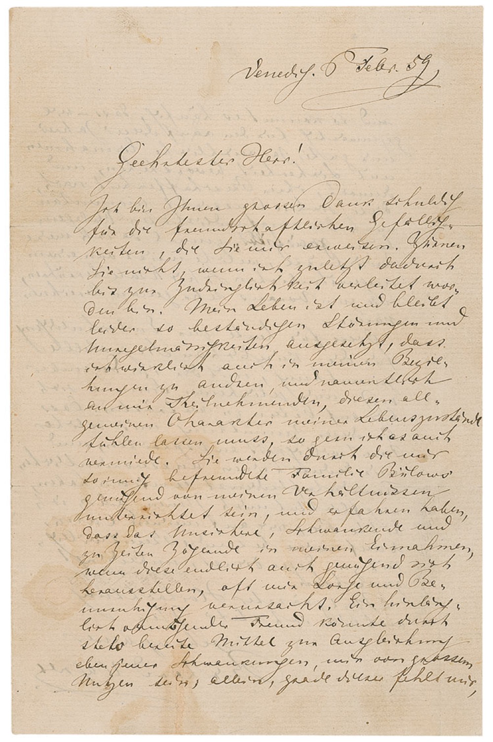 When Wagner wrote this letter he was recovering from a tumultuous period in his personal life. He had befriended Otto and Mathilde Wesendonck in Zurich in 1852. An admirer of his music, Otto rented Wagner and his wife Minna a small house on his estate in 1857. Wagner became infatuated with his patron's wife, the poet-writer Mathilde, who returned his affections while being careful not to endanger her own marriage. The likely unconsummated love affair inspired the composer to stop work on the Ring in favor of Tristan und Isolde, a work infused with his passion for Mathilde. When Wagner's wife intercepted a letter he wrote for Mathilde in the summer of 1858, the affair came to an unpleasant end and Wagner removed to Venice alone, where he would complete the second act to Tristan. When he wrote this letter in February of 1859, Wagner's residence in Venice was becoming untenable. In addition to suffering poor health and police harassment from the Austrian authorities, he had run out of money. In March, the unstable political situation between the Italian nationalists and Austrian military finally prompted Wagner to leave Venice for Lucerne, where he would finish Tristan und Isolde in August.