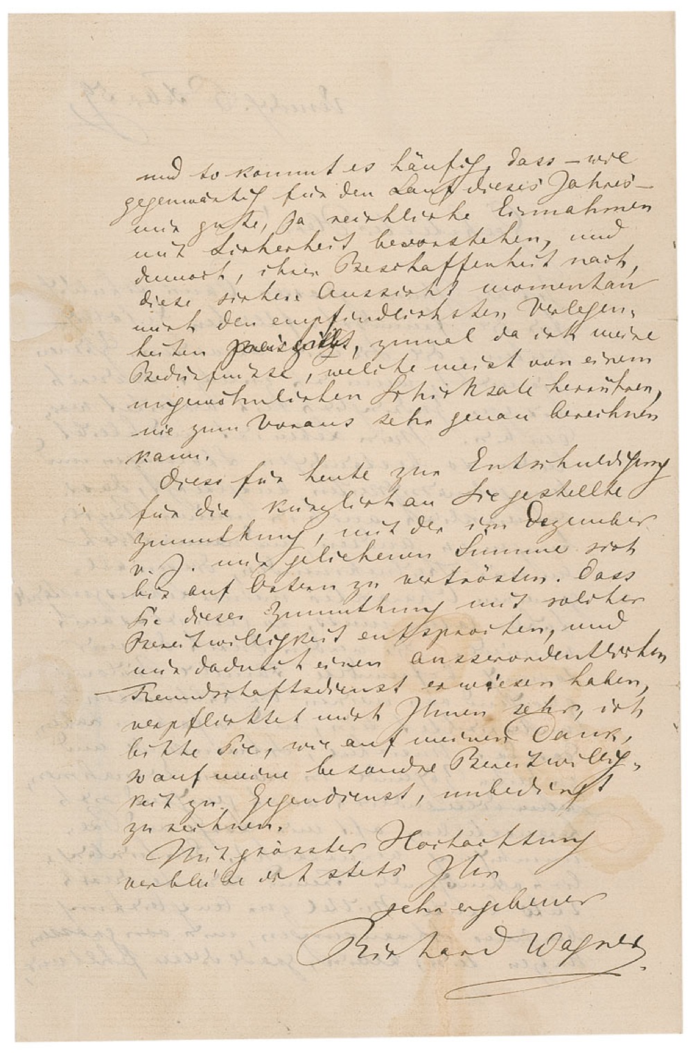 ALS in German, 5.25 x 8, February 6, 1859. A beautifully penned letter and address panel in Wagner’s florid hand, translated, in full: “I am indeed highly indebted to you for the kindness and generosity you have extended to me as a friend. Please don’t be angry with me for allowing this conduct of mine to eventually border on intrusiveness. My life is, always has been, exposed to an unending stream of upheavals and uncertainties that inadvertently reflected unfavorably on my personal relationships, as much as I would have wanted avoiding this. I very much regret that the general character of my life’s circumstances often encroached on so many people close to me. Assuming you are pretty well informed of my current situation through the Bülows, a family and friends very dear to me. Consequently you probably know that in these difficult and uncertain times, the sluggish flow of my earnings, which ordinarily would certainly be adequate, causes me much grief and worry. An independently wealthy friend would therefore be of great help by providing the means and support needed to balance these fluctuations. Regrettably, just now I am not so fortunate and thus over the course of this year find myself in considerable financial difficulties. While prospects for a good, I venture to say, abundant flow of income exist, only failed to materialize so far. As I see it, my needs and requirements, mostly caused by extraordinary strokes of fate are unforeseen and cannot be calculated in advance. This much for now, as an explanation for the nerve I recently displayed by asking for more patience with repayment of the sum of money you loaned to me in December of last year. I am enormously indebted for your most generous response and want you to know how much I appreciate this extra ordinary gesture of friendship. Please accept, in addition to my thanks, my sincere and unconditional offer for any service in return.” In very good condition, with a light diagonal crease and scattered light creasing, uniform toning, scattered light soiling, and a few areas of paper loss that have been professionally restored.