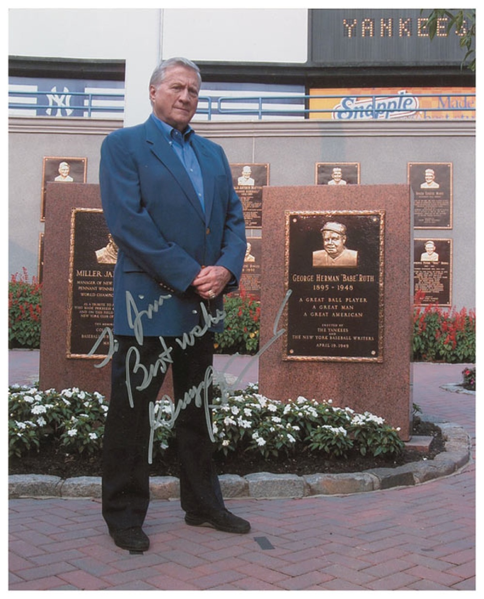 Color glossy 8 x 10 photo of The Boss in front of the Babe Ruth memorial at Yankee Stadium, signed and inscribed in silver ink, “To Jim, Best wishes, George Steinbrenner.” In fine condition, with some slight contrast to the signature. Pre-certified Steve Grad/PSA/DNA and RR Auction COA.