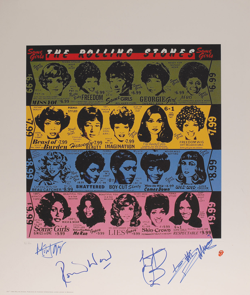 Color limited edition 22.5 x 26.5 print of their Some Girls album cover, numbered #72/90, signed in the lower border in blue felt tip by Mick Jagger, Keith Richards, Charlie Watts, and Ron Wood. Rolled and in fine condition. Pre-certified Roger Epperson/REAL and RR Auction COA.