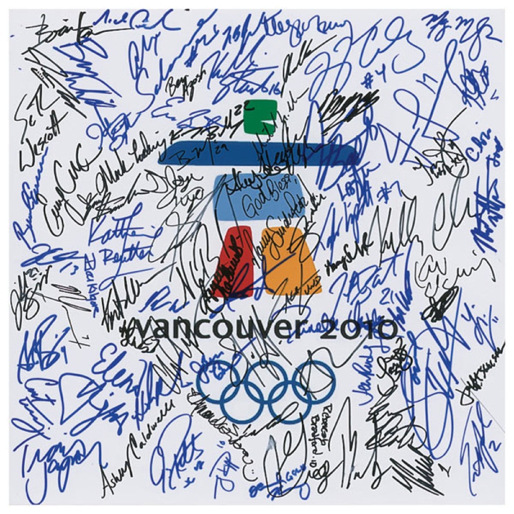 Color glossy 12 x 12 promotional photo from the 2010 Vancouver Olympics, signed in black or blue felt tip by 61 Olympic athletes and eight Paralympic athletes. Signers are: Hannah Kearney, Meryl Davis, Megan McJames, Josh Applegate (coach), Steven Holcomb, Curtis Tomasevicz, Nick Cunningham, John Napier, Jamie Moriarty, Torin Koos, Andrew Newell, James Southam, Elizabeth Stephen, John Benton, Jeff Isaacson, Chris Plys, Mirai Nagasu, Tanith Belbin, Ben Agosto, Evan Bates, Emily Samuelson, Amanda Evora, Mark Ladwig, Jeremy Barrett, Hannah Kearney, Emily Cook, Lacy Schnoor, Ashley Caldwell, Kacey Bellamy, Julie Chu, Erika Lawler, Brianne McLaughlin, Angela Ruggiero, Molly Schaus, Kelli Stack, Karen Thatcher, Hilary Knight, Lisa Chesson, Jinelle Zaugg, Dan Joye, Johnny Spillane, Katherine Reutter, Travis Jayner, Jordan Malone, Zach Lund, Katie Uhlaender, Seth Wescott, Louie Vito, Gregory Bretz, Lindsey Jacobellis, Kelly Clark, Elena Hight, Faye Gulini, Brian Hewson, Mitchell Whitmore, Lauren Cholewinski, Maria Lamb, Elli Ochowicz, Nancy Swider-Peltz Jr., Jen Rodriguez, Heather Richardson, Rebekah Bradford, Brad Emmerson, Taylor Lipsett, Alexi Salamone, Jimmy Connelly, Bradley Washburn, Kelly Underkofler, and Ricci Kilgore. In fine condition, with some trivial brushing to a few of the signatures. Pre-certified Steve Grad/PSA/DNA and RR Auction COA.