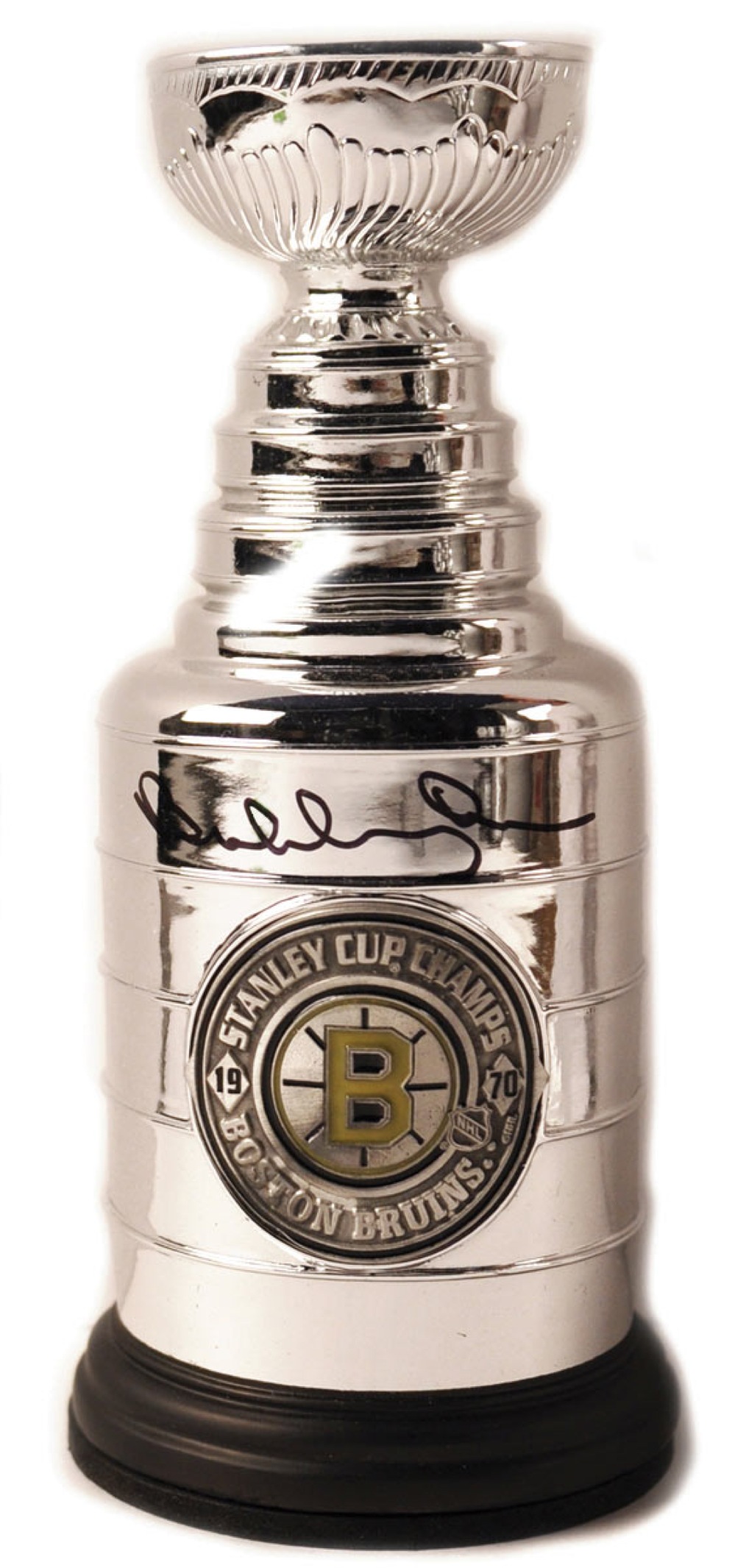 Official NHL metallic pewter replica of the Stanley Cup trophy from the Bruin’s 1970 championship, 3 x 7.5, complete in original packaging which measures 5 x 9.25, signed above the championship medallion in black felt tip. In fine condition, with a holographic authentication label affixed to the bottom of the box, and the expected wear to the packaging. Accompanied by a certificate of authenticity from Great North Road, Orr’s memorabilia company. Pre-certified Steve Grad/PSA/DNA and RR Auction COA.