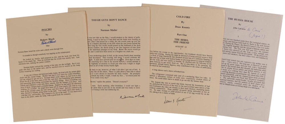 Four souvenir typescripts on separate 8.5 x 11 pages, each signed in felt tip by the respective author. Signers are: Norman Mailer (Tough Guys Don’t Dance) Robert Bloch (Psycho), John le Carre (The Russia House), and Dean Koontz (Cold Fire). In overall fine condition, with le Carre making a correction to his name on the typescript. RRAuction COA.