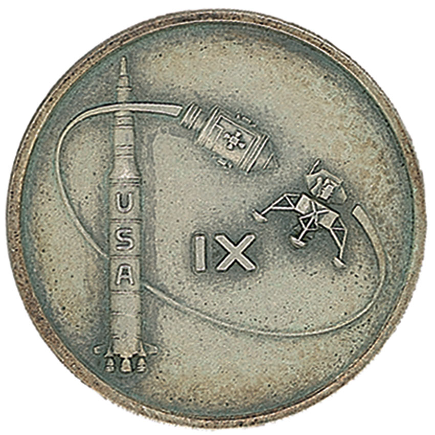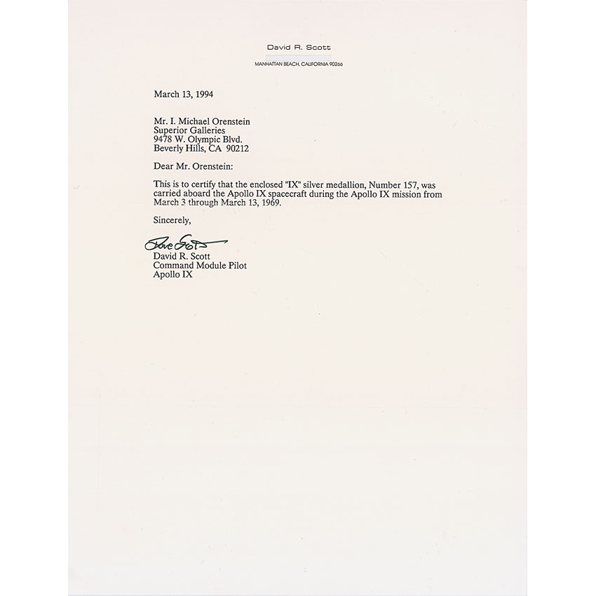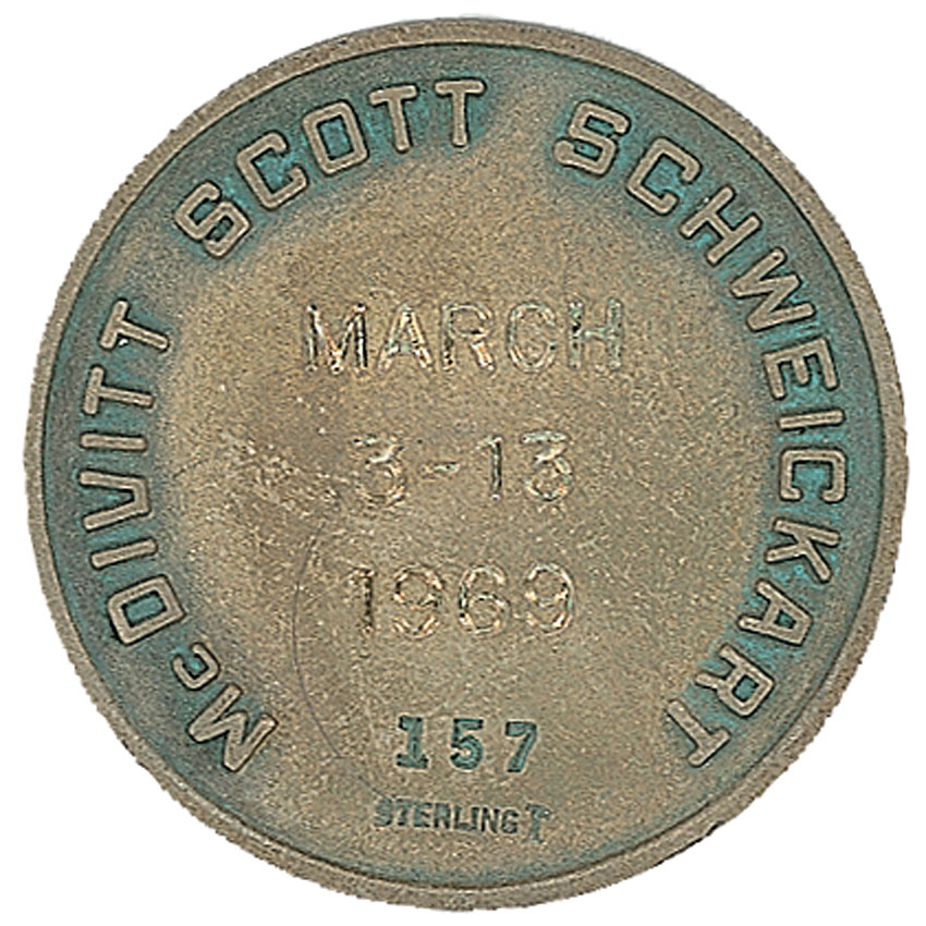 Flown sterling silver Apollo 9 Robbins Medal, approximately 1-inch diameter, with a raised design on the face of the mission insignia. The reverse of the sterling silver medal is engraved with the last names of astronauts James McDivitt, Dave Scott, and Rusty Schweickart, as well as “March 3–13, 1969” and is serial numbered “157.” Normal condition. Accompanied by a 1994 letter of authenticity from Apollo 9 command module pilot Dave Scott, which reads, “This is to certify that the enclosed ‘IX’ silver medallion, Number 157, was carried aboard the Apollo IX spacecraft during the Apollo IX mission from March 3 through March 13, 1969.” Also accompanied by its original presentation case also numbered “157.” RRAuction COA.