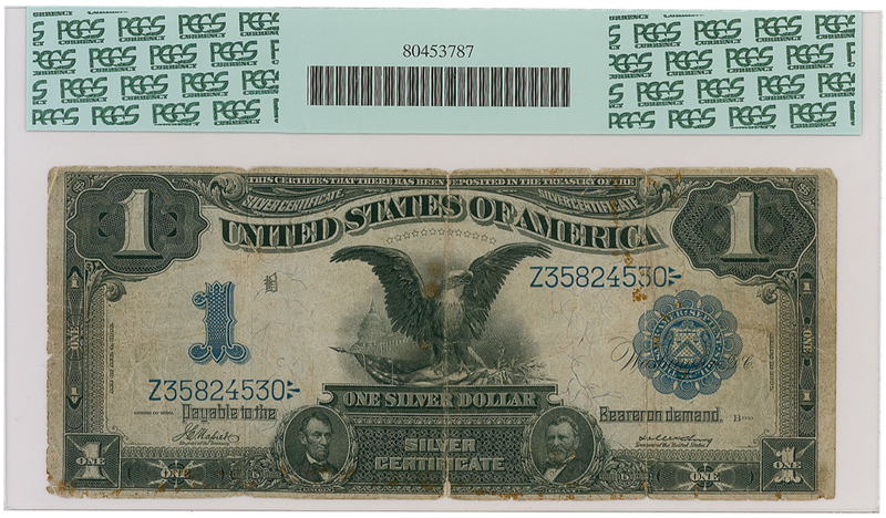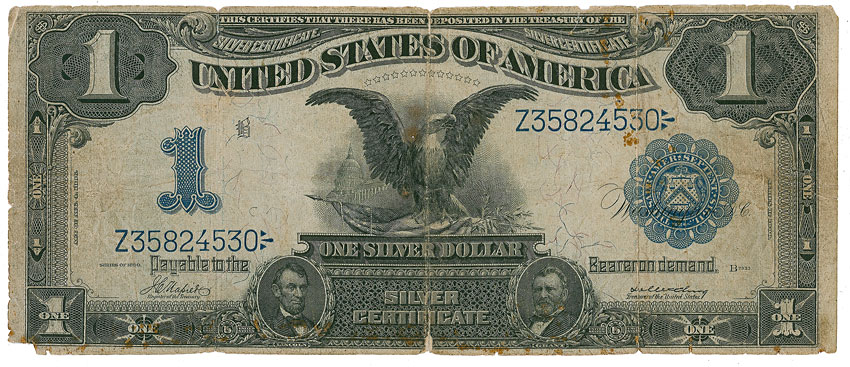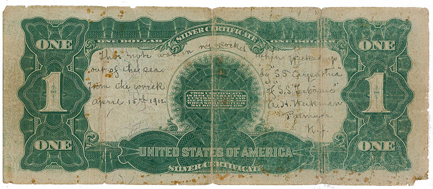 A United States Series 1899 silver dollar certificate, 7.5 x 3.25, signed and inscribed by S.S. Titanic survivor August H. Weikman, “This note was in my pocket when picked up out of the sea by 'S.S. Carpathia' from the wreck of 'S.S. Titanic' April 15th 1912/A.H. Weikman/Palmyra, N.J.” Small separations along the three vertical folds, scattered light foxing, soiling, a few small chips to edges, a couple small pinpricks to body, otherwise very good condition.
