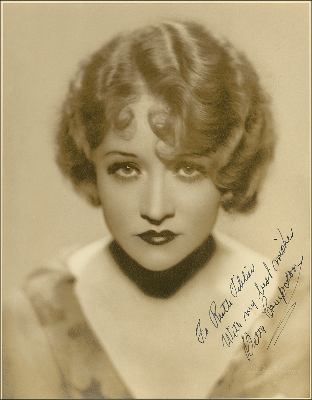 Gorgeous vintage sepia matte-finish 10.5 x 13.5 Preston Duncan head-and-shoulders photo, signed and inscribed in fountain pen, “To Ruth Tiblier, With my best wishes, Betty Compson.” A slight bend to the photo, a light crease running parallel to the left edge, and light silvering to some of the darker areas of the image, otherwise fine condition. Pre-certified PSA/DNA and RR Auction COA.