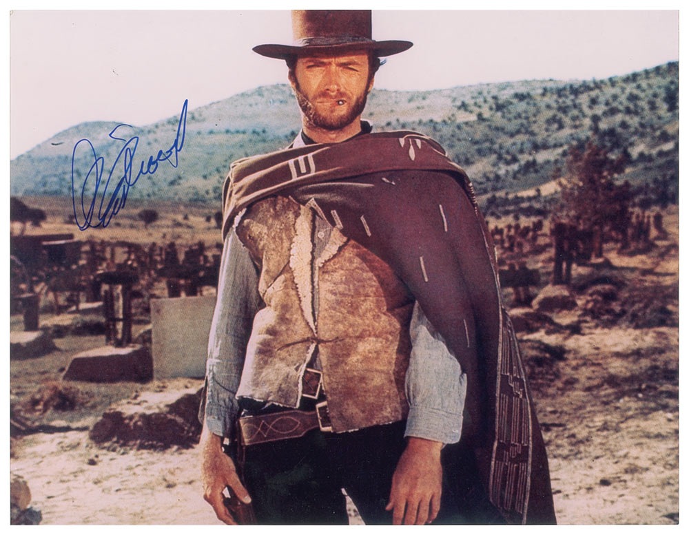 Color glossy 14 x 11 photo of Eastwood in one of his early westerns, signed in-person in blue felt tip. In fine condition. Originally obtained by in-person specialist Mike Wehrmann. Pre-certified PSA/DNA and RR Auction COA.