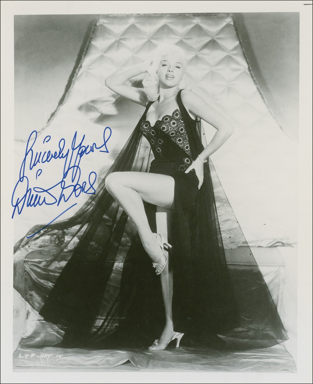Ravishing glossy 8 x 10 photo of Dors showing some leg in a black chiffon dress, signed in blue felt tip, “Sincerely yours, Diana Dors.” In fine condition, with a few scattered light creases and surface marks. Pre-certified PSA/DNA and RR Auction COA.