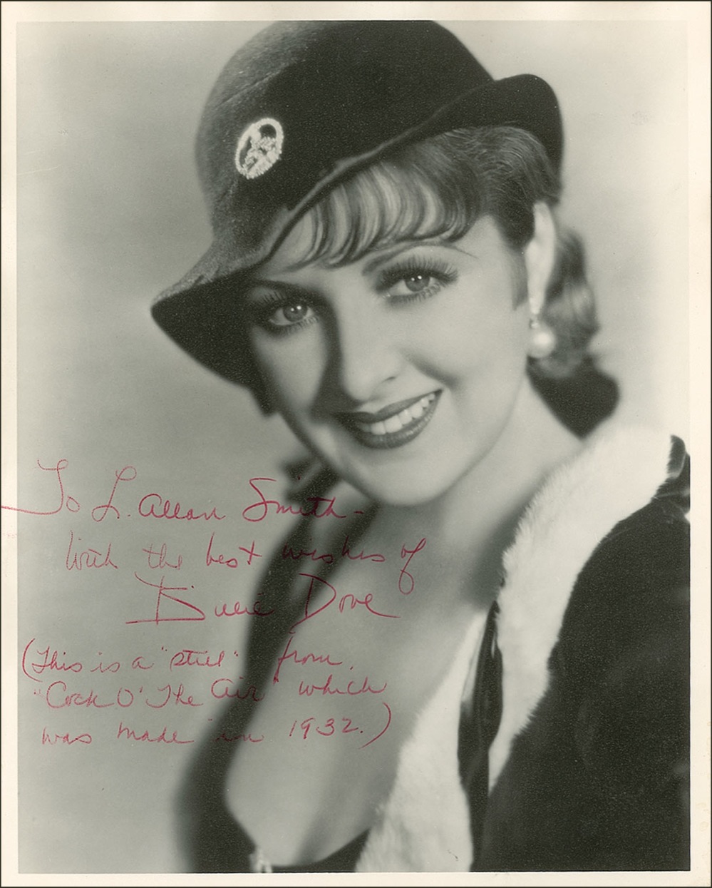 Crisp matte-finish 8 x 10 publicity photo of Dove from Cock of the Air, signed and inscribed in red felt tip, “To L. Allan Smith—With the best wishes of Billie Dove (This is a ‘still’ from ‘Cock O’ The Air’ which was made in 1932).” In fine condition, with some light toning and a few dings to the edges, and some slight contrast to the signature. Pre-certified PSA/DNA and RR Auction COA.