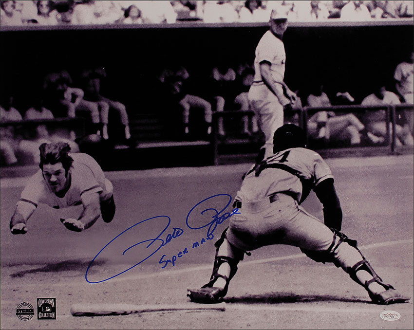 Glossy 20 x 16 photo of Rose in the midst of a head-first slide into home plate, signed in blue felt tip, “Pete Rose, Superman.” In fine condition, with a James Spence authentication label affixed to lower corner. Accompanied by a certificate of authenticity from James Spence. Pre-certified Steve Grad/PSA/DNA and RR Auction COA.
