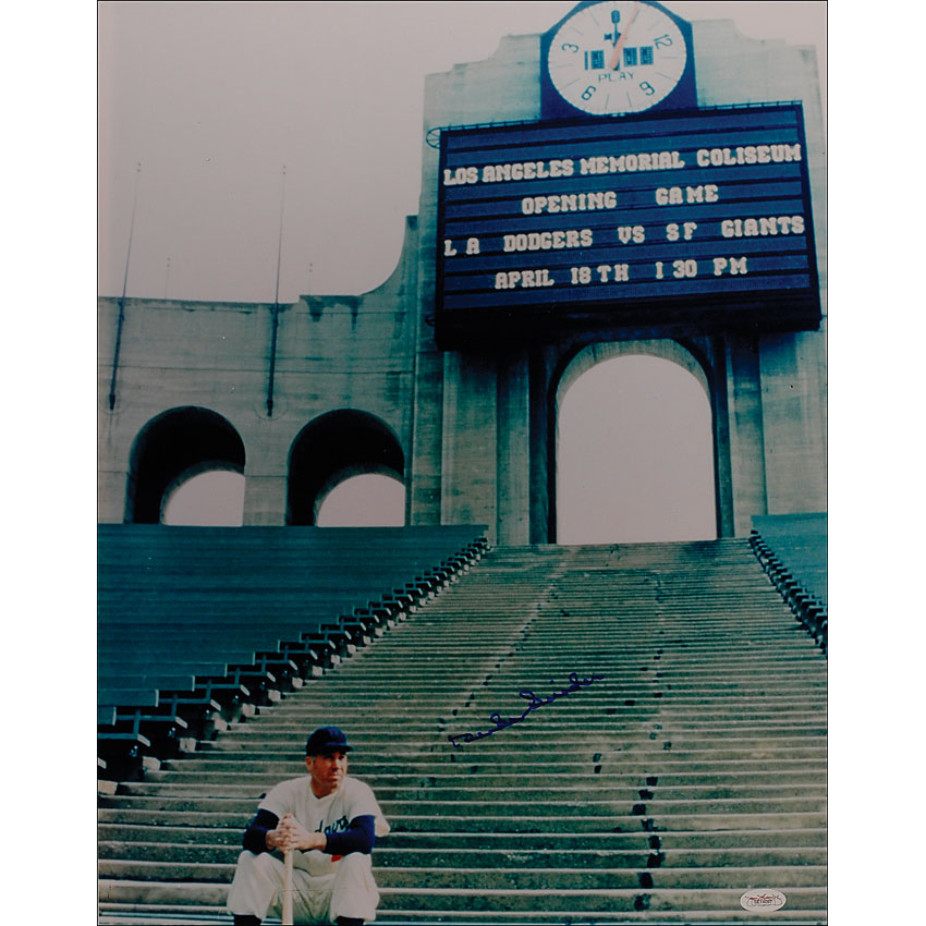 Color glossy 16 x 20 photo of Snider sitting in the stands of the L. A. Coliseum on opening day of the Los Angeles Dodgers season, signed in blue felt tip. In fine condition, with a James Spence authentication label affixed to lower corner. Accompanied by a certificate of authenticity from James Spence. Pre-certified Steve Grad/PSA/DNA and RR Auction COA.