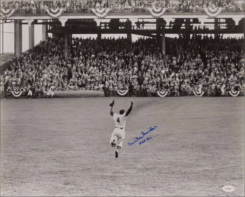 Glossy 20 x 16 photo of Snider leaping for joy in the outfield after a World Series victory, signed in blue felt tip, “Duke Snider HOF 80.” In fine condition, with a James Spence authentication label affixed to lower corner. Accompanied by a certificate of authenticity from James Spence. Pre-certified Steve Grad/PSA/DNA and RR Auction COA.