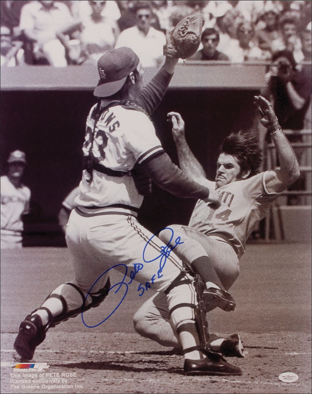 Glossy 16 x 20 photo of Rose sliding into home as Ted Simmons blocks the plate, signed in blue felt tip, “Pete Rose Safe.” In fine condition, with a James Spence authentication label affixed to lower corner. Accompanied by a certificate of authenticity from James Spence. Pre-certified Steve Grad/PSA/DNA and RR Auction COA.