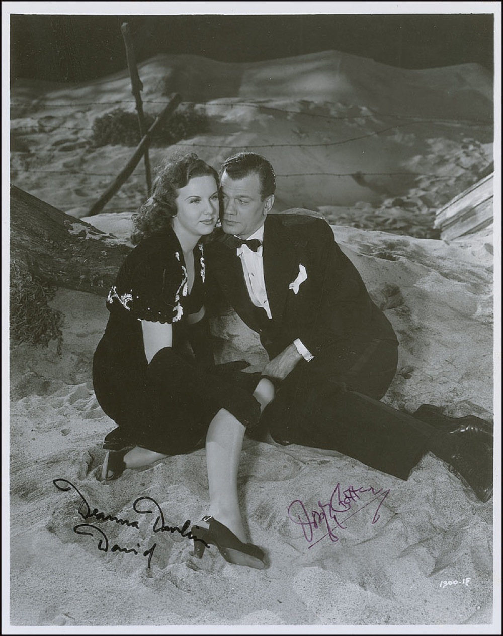 Glossy 8 x 10 photo of Cotten and Durbin on a sand dune in one of their films, signed in purple felt tip by Joseph Cotten and in black felt tip by “Deanna Durbin David.” In fine condition, with a few scattered light creases and surface marks. Pre-certified PSA/DNA and RR Auction COA.
