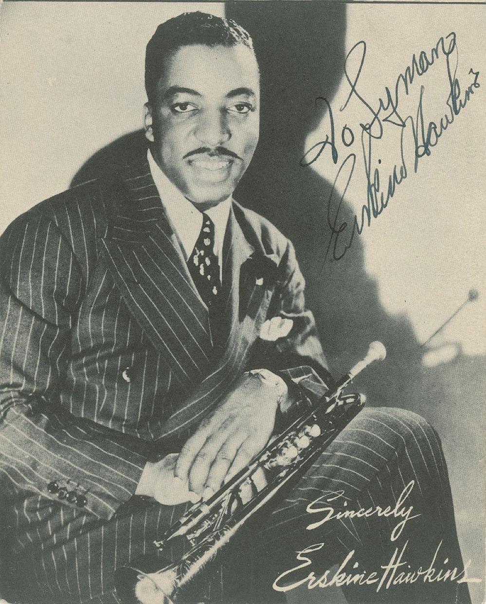 Vintage 5 x 6 lightweight photo of Hawkins posing with his trumpet, signed and inscribed in fountain pen “To Lyman, Erskine Hawkins.” In fine condition. RRAuction COA.