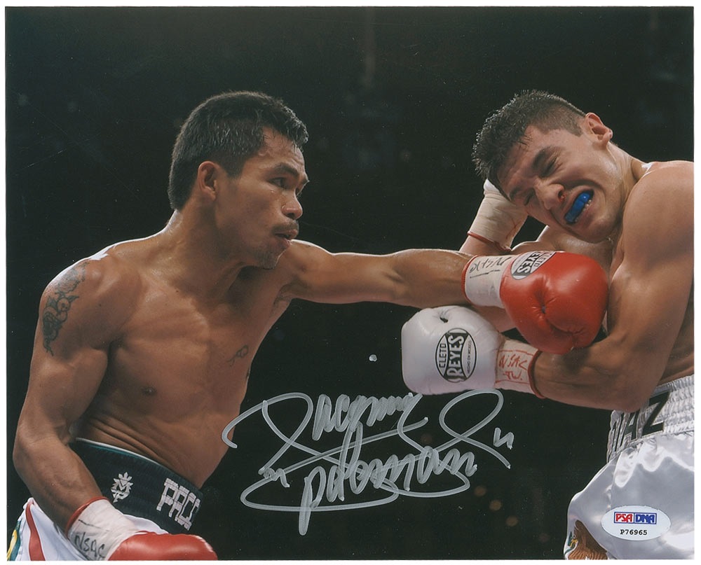 Color satin-finish 10 x 8 photo of Pacquiao pummeling David Diaz, signed in silver ink. In very fine condition, with a PSA/DNA authentication label affixed to lower corner. Accompanied by a certificate of authenticity from PSA/DNA. RRAuction COA.