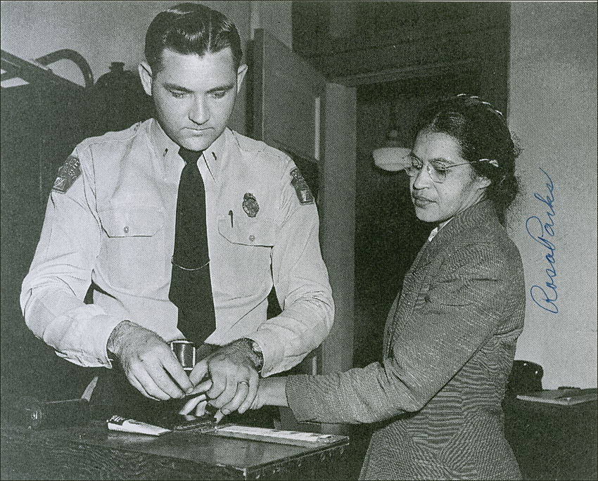 Glossy 10 x 8 laser-print photo of Parks having her fingerprints taken by a police officer, signed vertically in blue felt tip. In fine condition, with a bit of a grainy appearance. RRAuction COA.