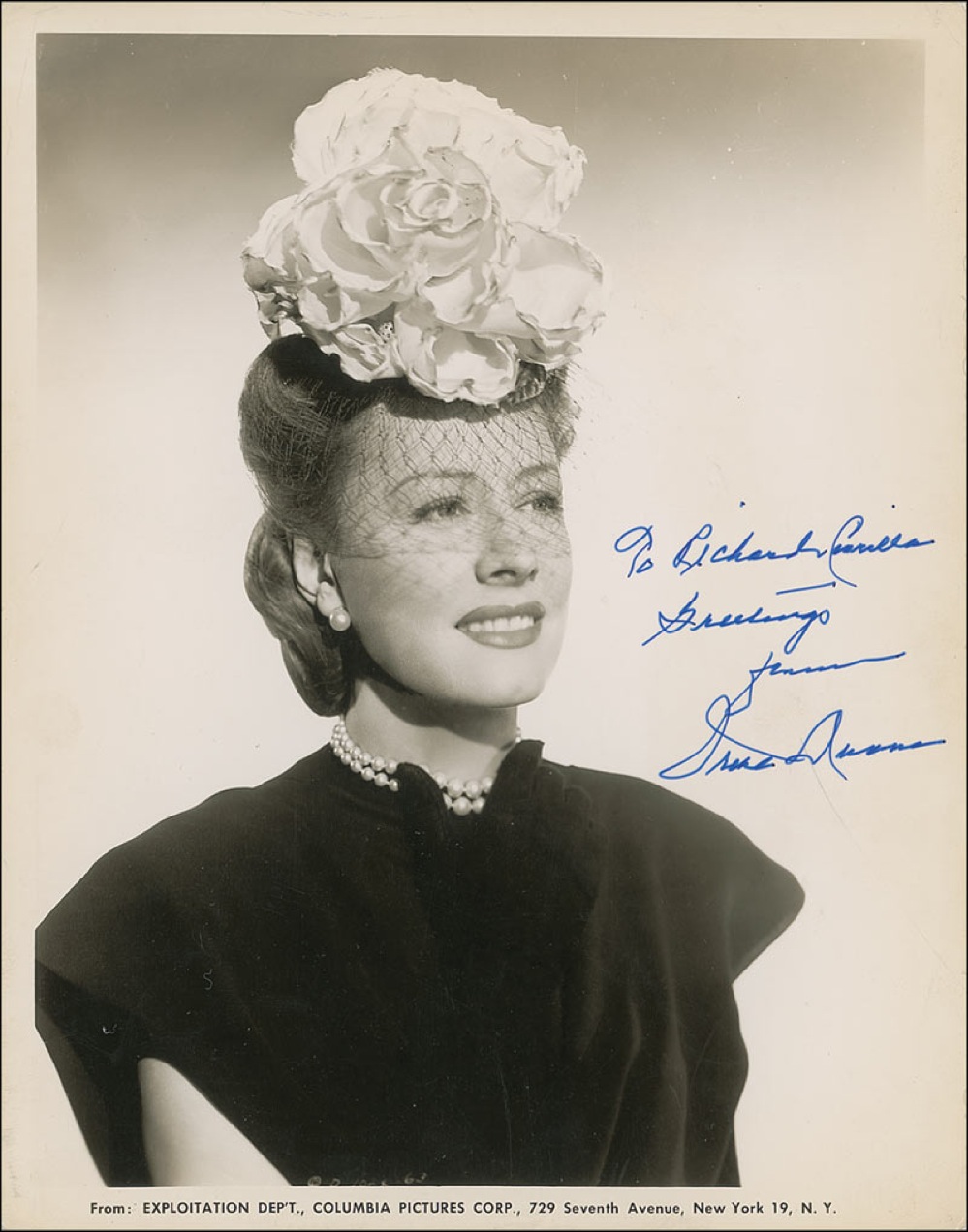 Glossy 8 x 10 Columbia Pictures promotional photo of Dunne in a flowered net veil, signed and inscribed in blue felt tip, “To Richard Cancilla, Greetings from Irene Dunne.” Some mild corner creasing, a few trivial surface marks, and faint criss-crossed streaking over the facial area, otherwise fine condition. Pre-certified PSA/DNA and RR Auction COA.