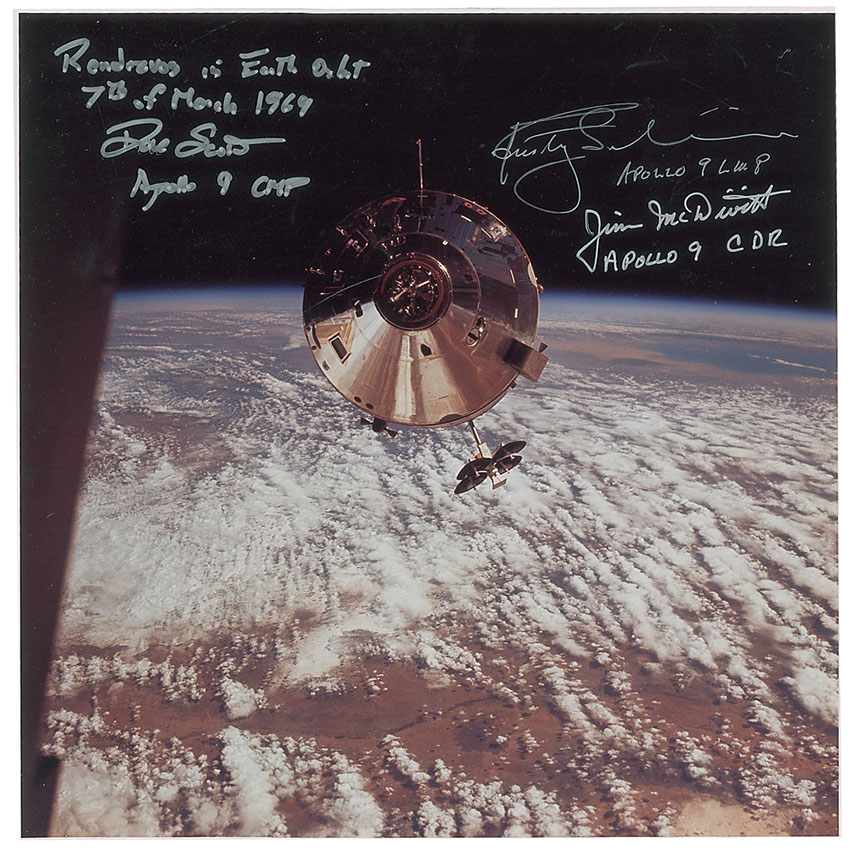 Exceptional color satin-finish 10 x 10 photo from the command module, signed in silver ink, “Rendezvous in Earth Orbit, 7th of March 1969, Dave Scott, Apollo 9 CMP,” “Rusty Schweickart,” and “Jim McDivitt, Apollo 9 CDR.” In fine condition, with a strip of adhesive remnant on the reverse. Pre-certified Steve Zarelli and RR Auction COA.