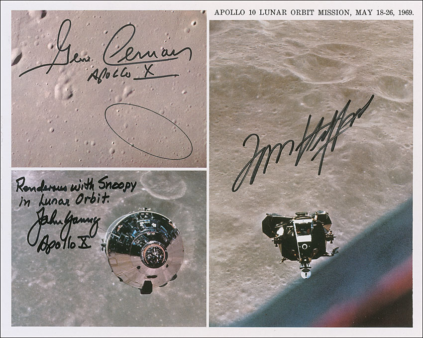 Color 10 x 8 NASA composite photo of the Apollo 10 mission, signed in black felt tip, “Gene Cernan, Apollo X,” “Rendezvous with Snoopy in Lunar Orbit, John Young, Apollo X,” and “Tom Stafford.” In fine condition. Accompanied by two certificates of authenticity from NovaSpace, one for Cernan and the other for Young. The three images featured have captured the southwest portion of the Sea of Tranquility on the lunar nearside, showing the areas of the Apollo Landing Site 2, the Command and Service Modules, and the ascent stage of the Lunar Module. A beautiful assemblage featuring exceptionally bold and crisp signatures from all three. Pre-certified Steve Zarelli and RR Auction COA.