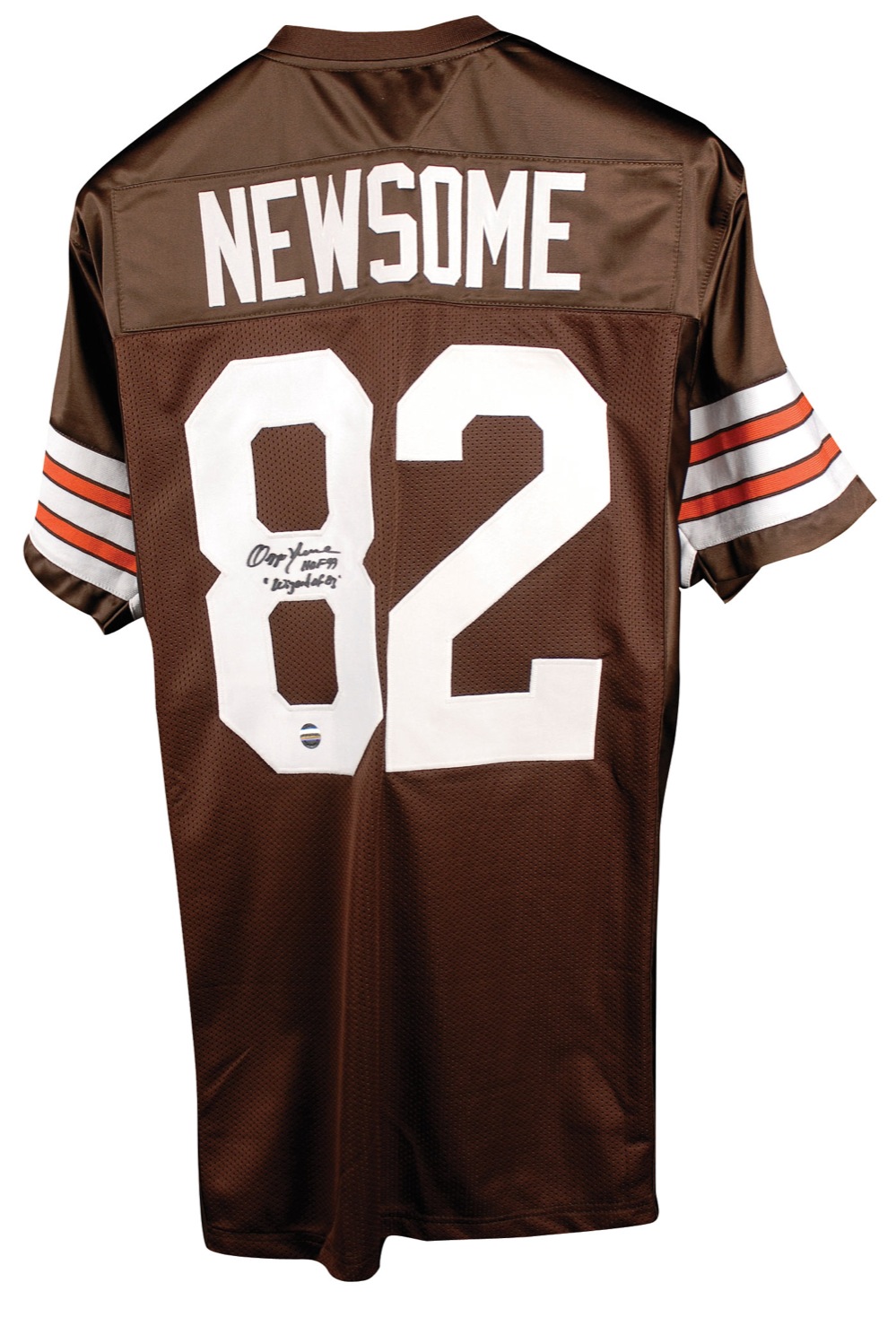 Replica Cleveland Browns football jersey, with sewn on letters and numbers, signed in black felt tip on the number on the back, “Ozzie Newsome HOF 99, ‘Wizard of Oz.’” In fine condition, with a slightly fuzzy appearance to signature. Pre-certified Steve Grad/PSA/DNA and RR Auction COA.
