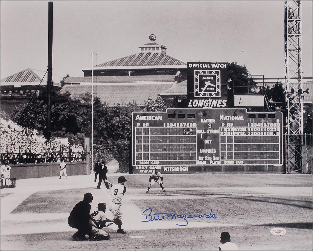 Satin-finish 20 x 16 photo of Mazeroski’s historic World Series winning home run in 1960, signed in blue felt tip. In very fine condition, with a James Spence authentication label affixed to lower corner. Pre-certified Steve Grad/PSA/DNA and RR Auction COA.
