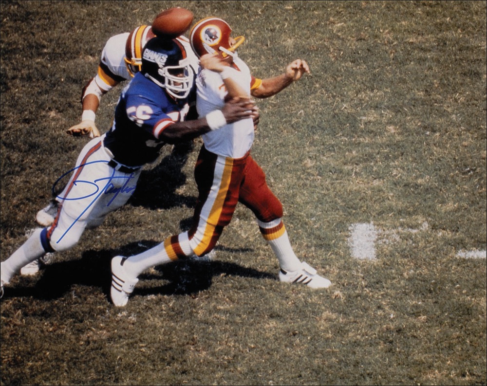 Color satin-finish 20 x 16 photo of Taylor attempting to sack Joe Theismann, signed in blue felt tip. In very fine condition. Pre-certified Steve Grad/PSA/DNA and RR Auction COA.
