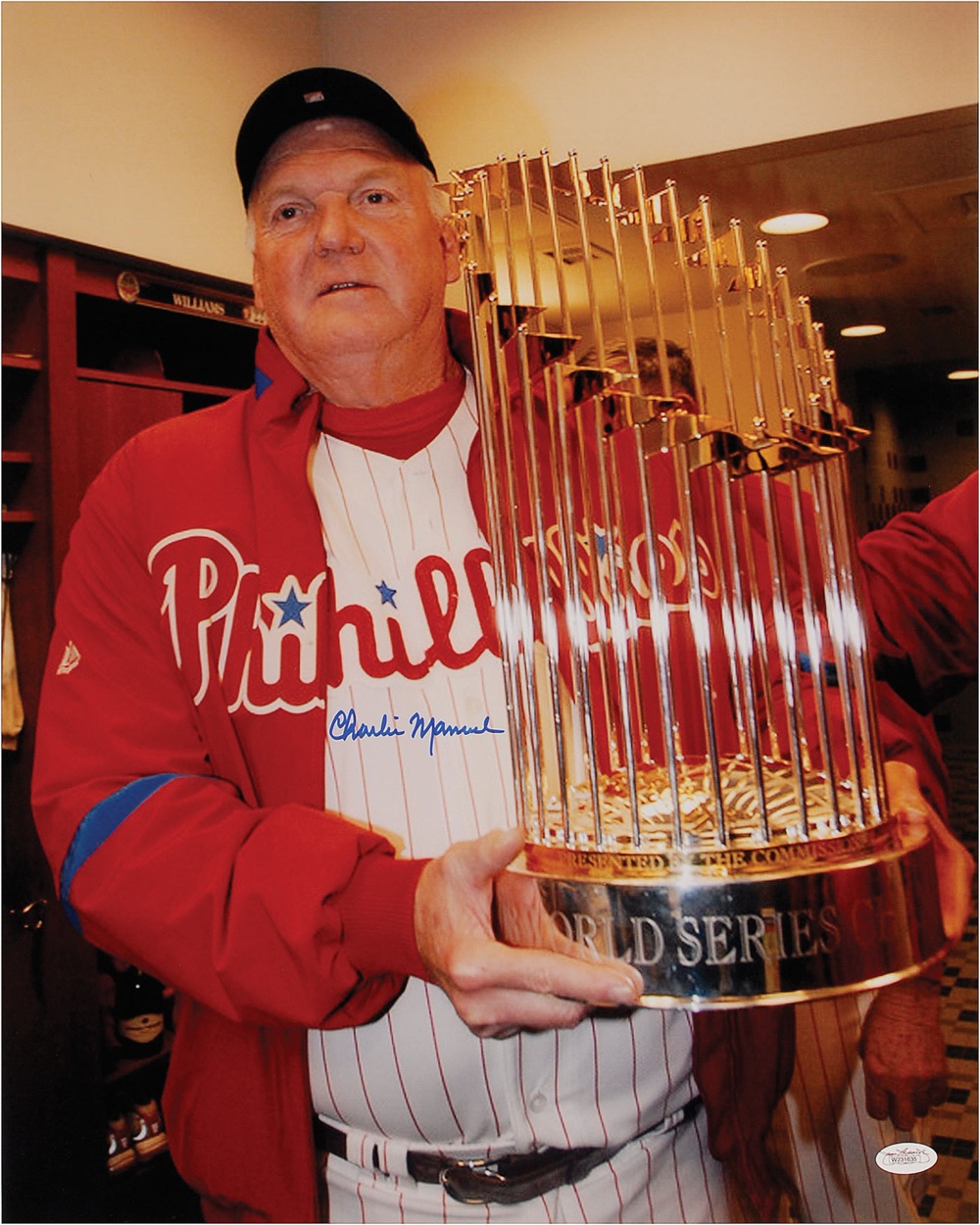 Color satin-finish 16 x 20 photo of the Phillies skipper holding the World Series trophy, signed in blue felt tip. In very fine condition, with a James Spence authentication label affixed to lower corner. Pre-certified Steve Grad/PSA/DNA and RR Auction COA.