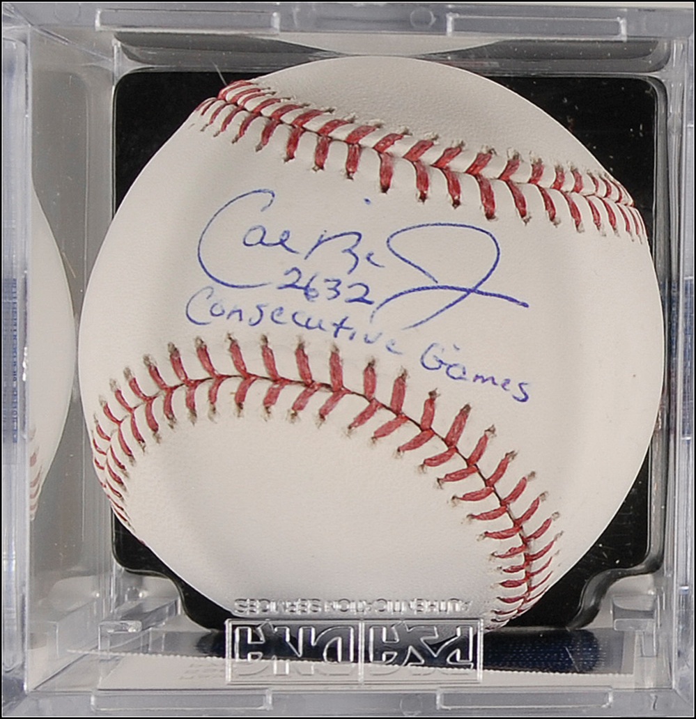 Official Rawlings Major League baseball signed in blue ballpoint on the sweet spot, “Cal Ripken, Jr., 2632 consecutive games.” Encapsulated in a plastic PSA/DNA authentication holder. In very fine condition. Accompanied by a certificate of authenticity from PSA/DNA, grading the ball, autograph and overall condition a “9” each. RRAuction COA.