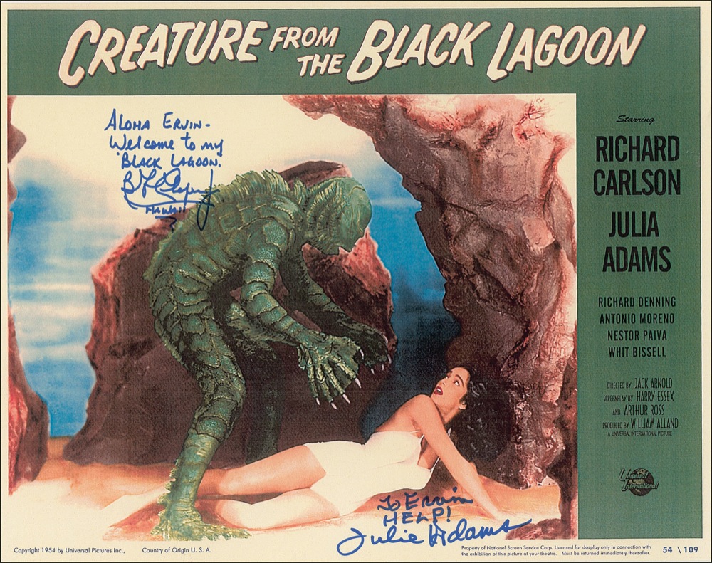 Reproduction color 14 x 11 lobby card for Creature from the Black Lagoon, signed and inscribed in blue felt tip, “Aloha Ervin—Welcome to my ‘Black Lagoon.’ Ben Chapman, Jr., Hawaii,” and “To Ervin Help! Julie Adams.” In fine condition. Pre-certified PSA/DNA and RR Auction COA.