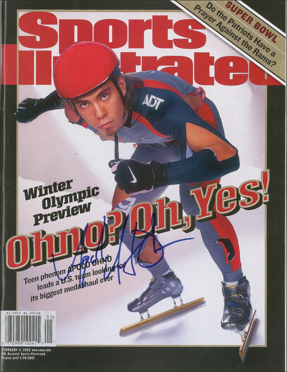 Sports Illustrated magazine, dated February 4, 2002, featuring Ohno on the cover, signed on the front cover in blue felt tip. In fine condition. Pre-certified Steve Grad/PSA/DNA and RR Auction COA.