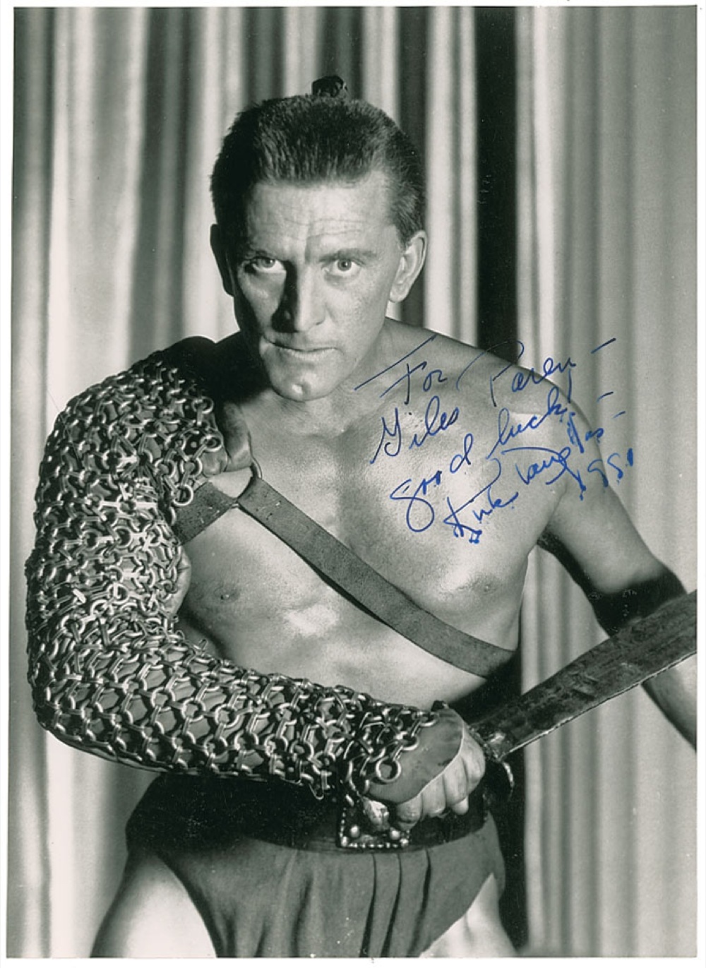 Vintage glossy 6.5 x 9.25 photo of Douglas as Spartacus, signed and inscribed in fountain pen, “To Giles Paren—Good luck—Kirk Douglas, 1981.” In fine condition, with trimmed edges and scattered smudging to the signature and inscription. Pre-certified PSA/DNA and RR Auction COA.