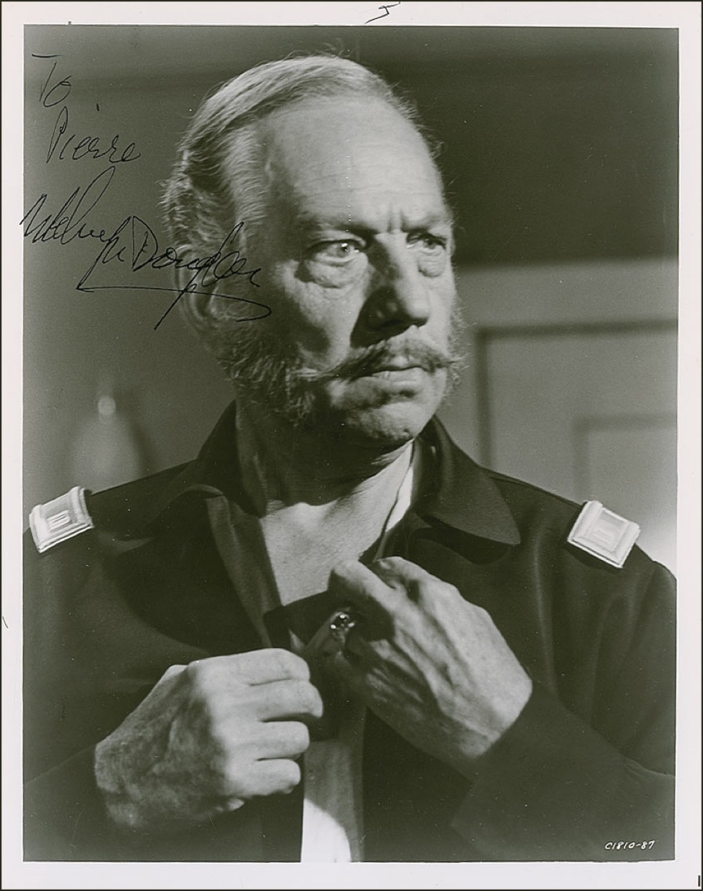 Glossy 8 x 10 publicity photo of Douglas as Colonel Claude Brackenbury from Advance to the Rear, signed and inscribed in-person in fountain pen, “To Pierre, Melvyn Douglas.” In fine condition, with a stray ink mark to the top edge. Pre-certified PSA/DNA and RR Auction COA.