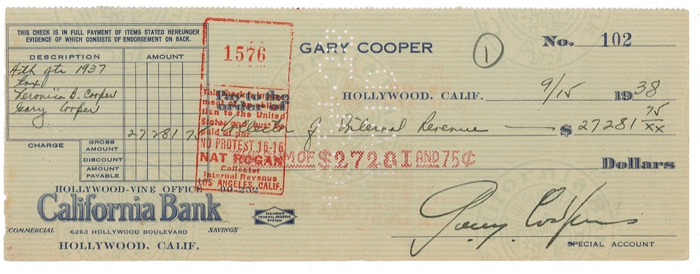 Personal check, 8 x 3, filled out in another hand and signed by Cooper, payable to Collector of Internal Revenue for $27281.75, September 15, 1938. Memo lines read, “4th qtr 1937 tax, Veronica B. Cooper, Gary Cooper.” A vertical fold to right side passing through one letter of signature, and expected cancellation stamps and holes, otherwise fine condition. An astronomical amount for its time, this check is a clear reflection of Cooper’s highly-paid star appeal. Pre-certified PSA/DNA and RR Auction COA.