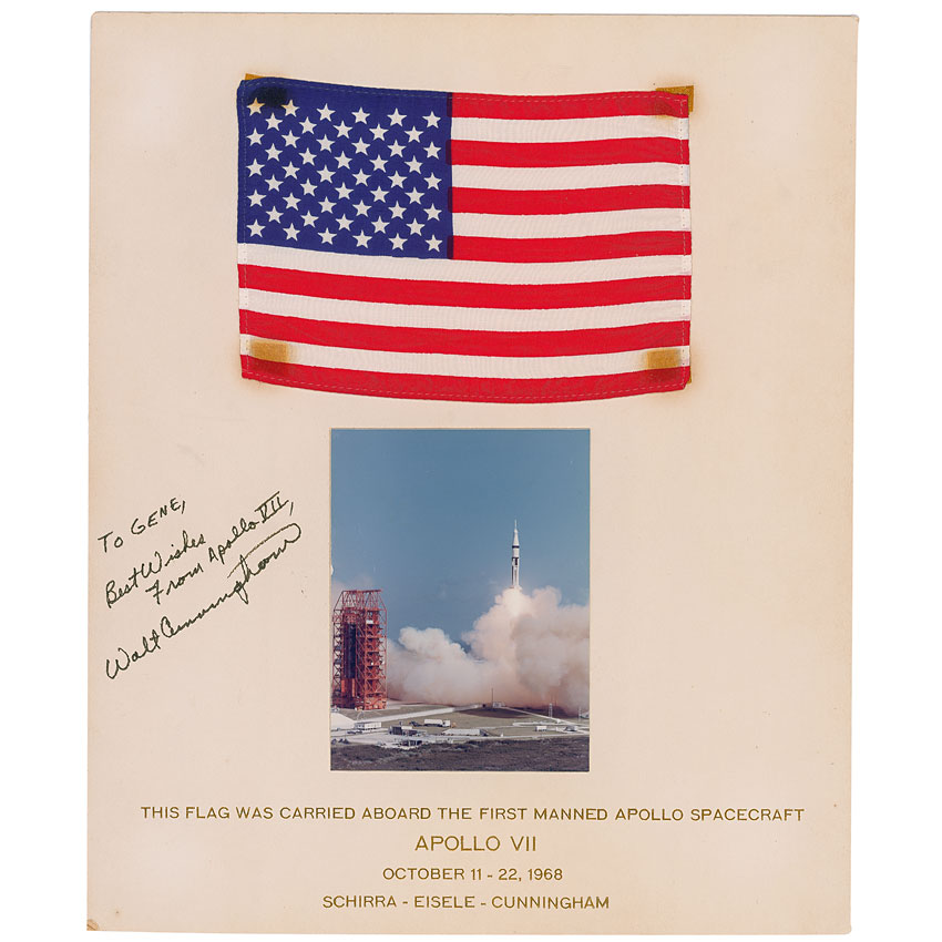 Flown printed fabric American flag, 6 x 4, flown aboard Apollo 7, the first manned Apollo mission. Flag is affixed by its corners to a 10 x 12 presentation mount, along with a color image of the mission’s launch, stating “This flag was carried aboard the first manned Apollo spacecraft Apollo VII. October 11–22, 1968. Schirra-Eisele-Cunningham.” Mount is signed and inscribed in black ink, “To Gene, Best wishes from Apollo VII, Walt Cunningham.” In fine condition, with small squares of toning to each corner of flag from adhesive on reverse. Pre-certified Steve Zarelli and RR Auction COA.