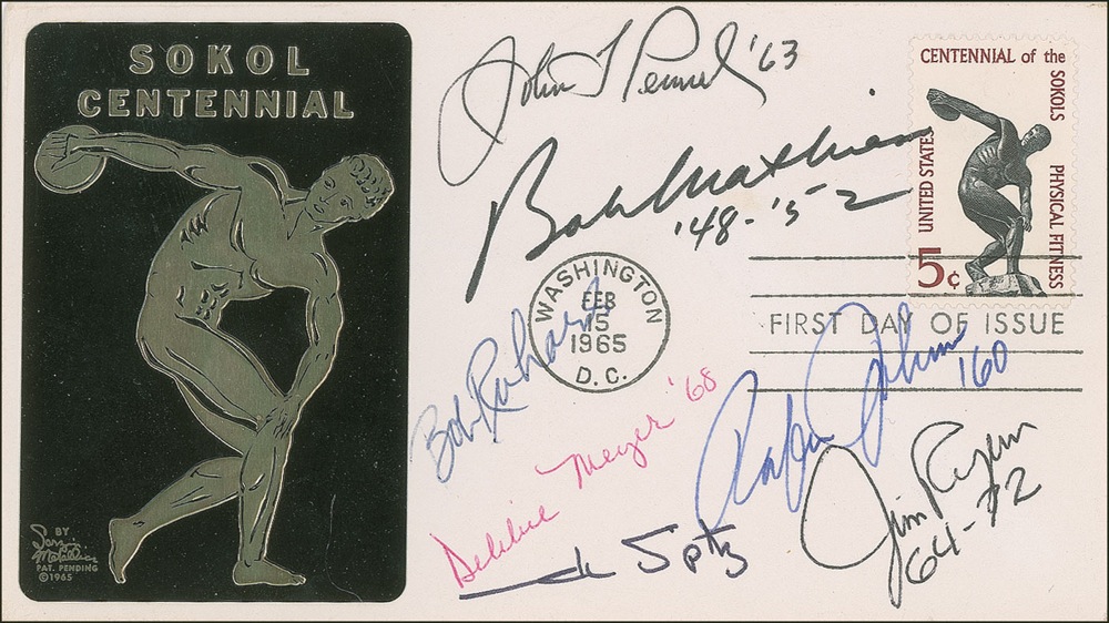 FDC with a metallic cachet honoring the Sokol Centennial, signed in ink and felt tip by seven gold medalists including Bob Mathias, Mark Spitz, Rafer Johnson, Debbie Meyer, and Jim Ryan. In fine condition. Pre-certified Steve Grad/PSA/DNA and RR Auction COA.