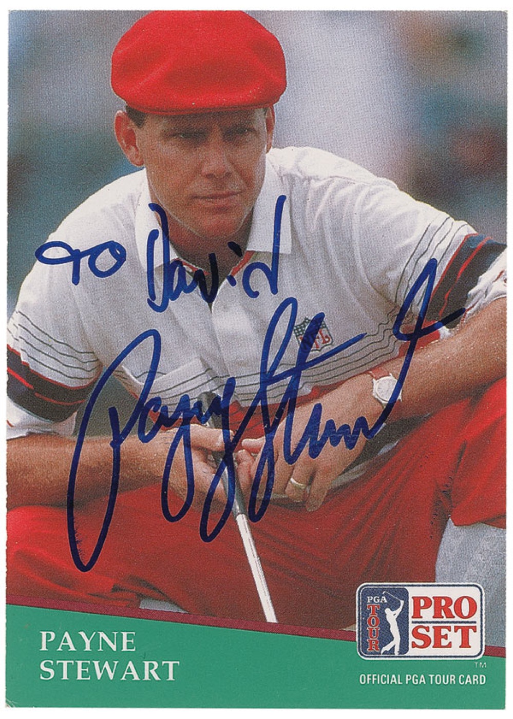 Pro Set official PGA Tour 1991 trading card, 2.5 x 3.5, signed and inscribed on the front in blue felt tip, “To David, Payne Stewart.” In fine condition. Pre-certified Steve Grad/PSA/DNA and RR Auction COA.