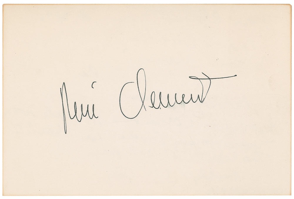 French film director and screenwriter (1913–1996). Ink signature, “Rene Clement,” on an off-white 6 x 4 card. In fine condition, with a bit of light edge toning. Signature originates from noted Hollywood collector Buddy George Marshall. Pre-certified PSA/DNA and RR Auction COA.