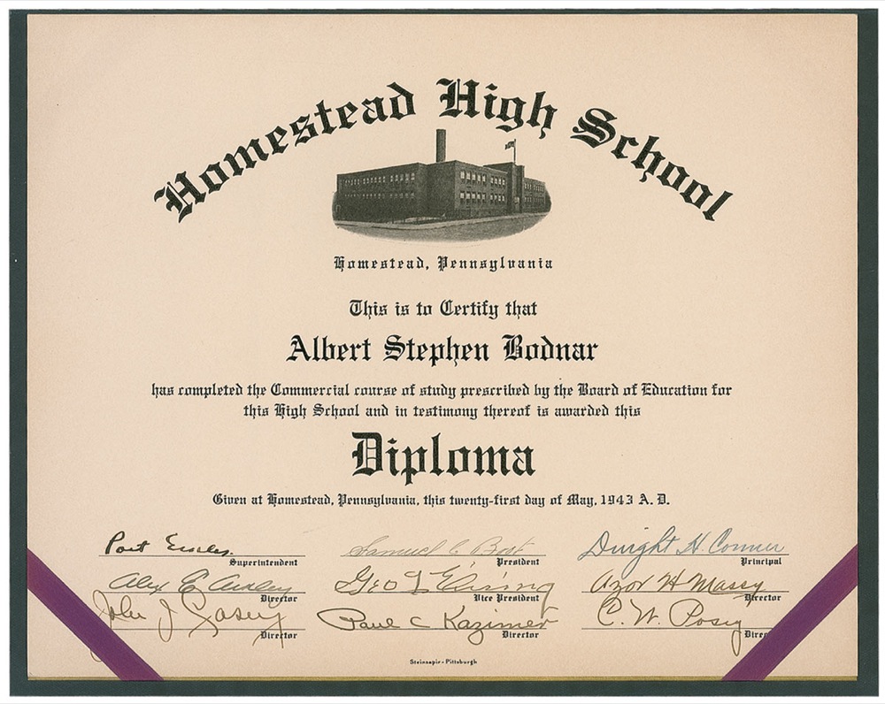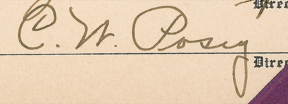 DS, signed “C. W. Posey,” one page, 10 x 8, May 21, 1943. Homestead [Pennsylvania] High School diploma issued to Albert Stephen Bodnar and signed by Posey as one of the school’s nine directors. In fine condition, with uniform light toning and a couple of faint creases. Accompanied by the original presentation folder. Posey is among the rarest of all Hall of Fame signatures. Pre-certified Steve Grad/PSA/DNA and RR Auction COA.