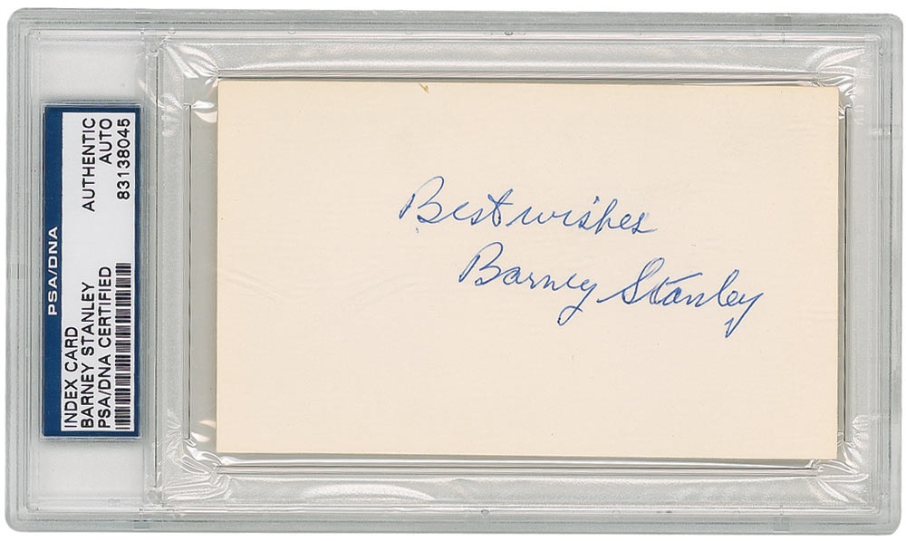 Member of the Hockey Hall of Fame (1893–1971). Ballpoint signature, “Best wishes, Barney Stanley,” on a 5 x 3 card. Encapsulated in a plastic PSA/DNA authentication holder. In fine condition. RRAuction COA.