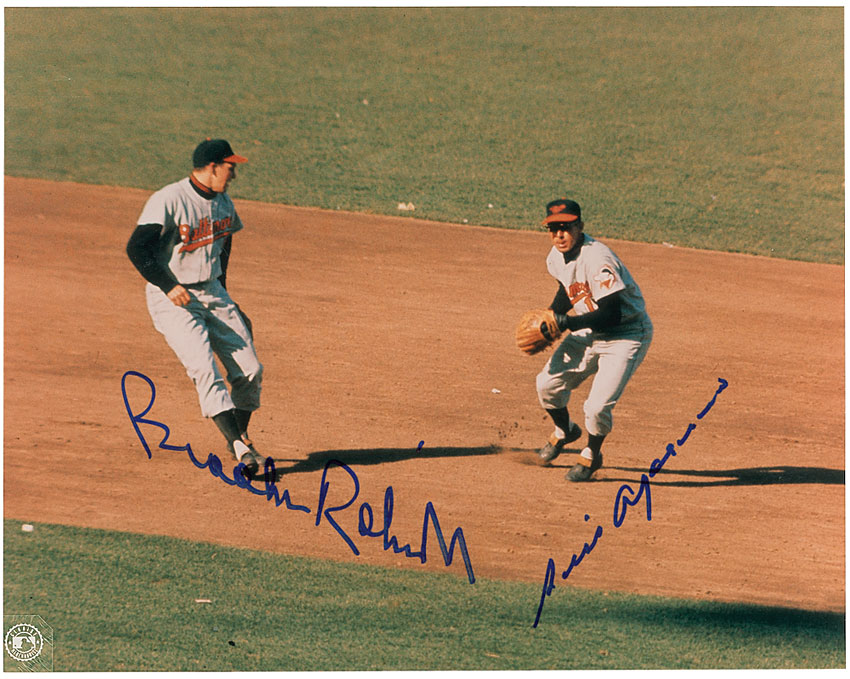 Color glossy 10 x 8 action photo of Robinson and Aparicio fielding a play, signed in blue felt tip by both. In fine condition. Pre-certified Steve Grad/PSA/DNA and RR Auction COA.
