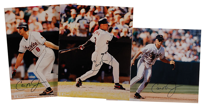 Three color glossy photos, 8 x 10 and 10 x 8, each featuring Ripkin in action for the Orioles, and each signed in black felt tip. In fine condition. RR Auction COA.