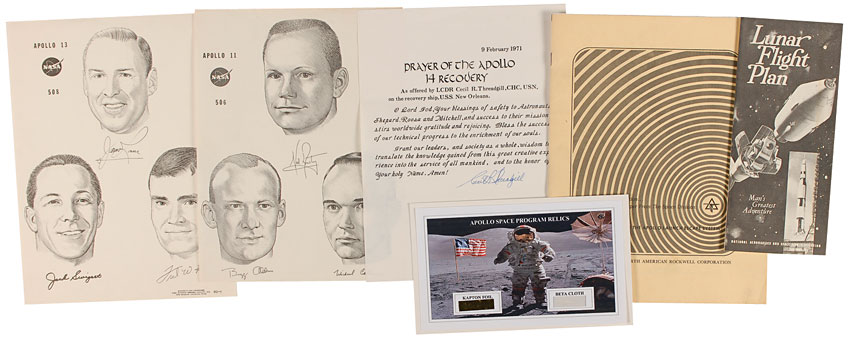 Six items: small fragments of Kapton foil and Beta cloth, materials developed for and used extensively in the space program, affixed to an 8 x 4.75 laserprint of an astronaut on the moon. The print is affixed to a slightly larger card; a technical paper from the Space Division of North American Rockwell Corporation entitled “Development of the Apollo Launch Escape System,” dated November 1967, 8.5 x 11, nine pages. This paper, prepared by three engineers defining the requirements and the specifications for the escape tower fitted to Apollo spacecraft; NASA brochure entitled “Lunar Flight Plan,” 4 x 9, published in 1967 by the NASA Public Affairs Office. The publication provides information on ‘Man’s Greatest Adventure’ and details how the lunar landing would take shape; two different Manned Flight Awareness posters, both 8.25 x 11, one with images of the Apollo 11 crew, the other having images of the Apollo 13 crew, with printed signatures of each crew member; and a printed prayer entitled, ‘Prayer of the Apollo 14 Recovery,’ 8 x 10.5, signed at the conclusion in blue ballpoint, “Cecil R. Threadgill.” Poem reads, in part: “O Lord God, Your blessings of safety to Astronauts Shepard, Roosa and Mitchell, and success to their mission, stirs worldwide gratitude and rejoicing. Bless the success of our technical progress to the enrichment of our souls.” In overall fine condition, with some light toning and handling wear. RRAuction COA.