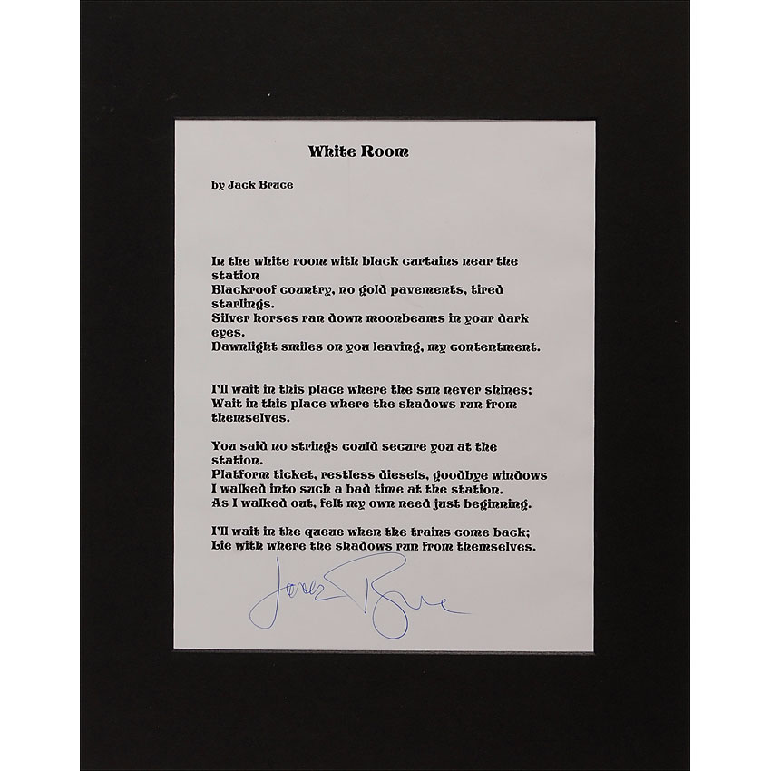 Printed souvenir lyrics to ‘White Room’ on a white 7.5 x 9.5 sheet, signed at the conclusion in blue ballpoint, “Jack Bruce.” Matted to an overall size of 11 x 14. In fine condition. Pre-certified Roger Epperson/REAL and RR Auction COA.