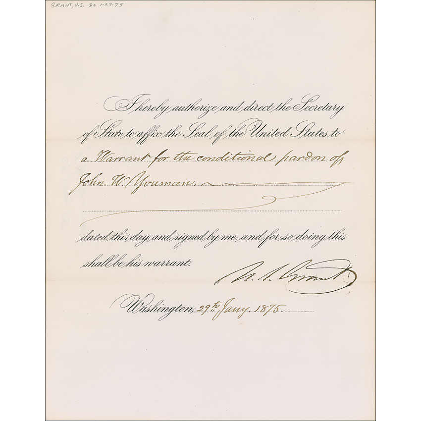 Partly-printed DS as president, one page, 7.75 x 10, January 29, 1875. Grant orders the Secretary of State “to affix the Seal of the United States to a Warrant for the conditional pardon of John W. Youman.” A horizontal fold light affecting the signature, light toning, a pencil notation to the top left corner, and feathering to the signature, otherwise fine condition. A desirable presidential document heralding from the same year Grant signed the Civil Rights Act of 1875. Pre-certified John Reznikoff/PSA/DNA and RR Auction COA.
