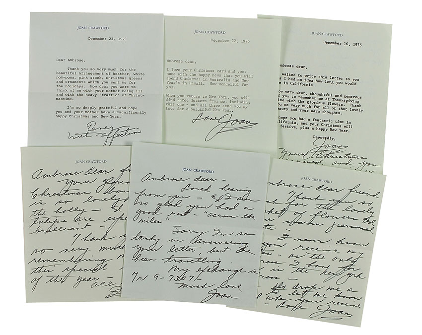 Five letters boldly signed “Joan,” three ALSs and two TLSs, one featuring a handwritten post script, all measuring 6 x 7 on personal stationery, and all dating from 1971 through 1976. Addressed to “Ambrose dear,” Crawford sends thanks for holiday wishes and gifts. In fine condition, with some light creasing. Accompanied by five original mailing envelopes, two addressed in Crawford’s hand, and an additional TLS, signed, “Ever with appreciation.” RRAuction COA.