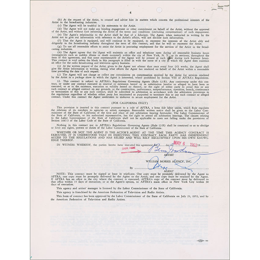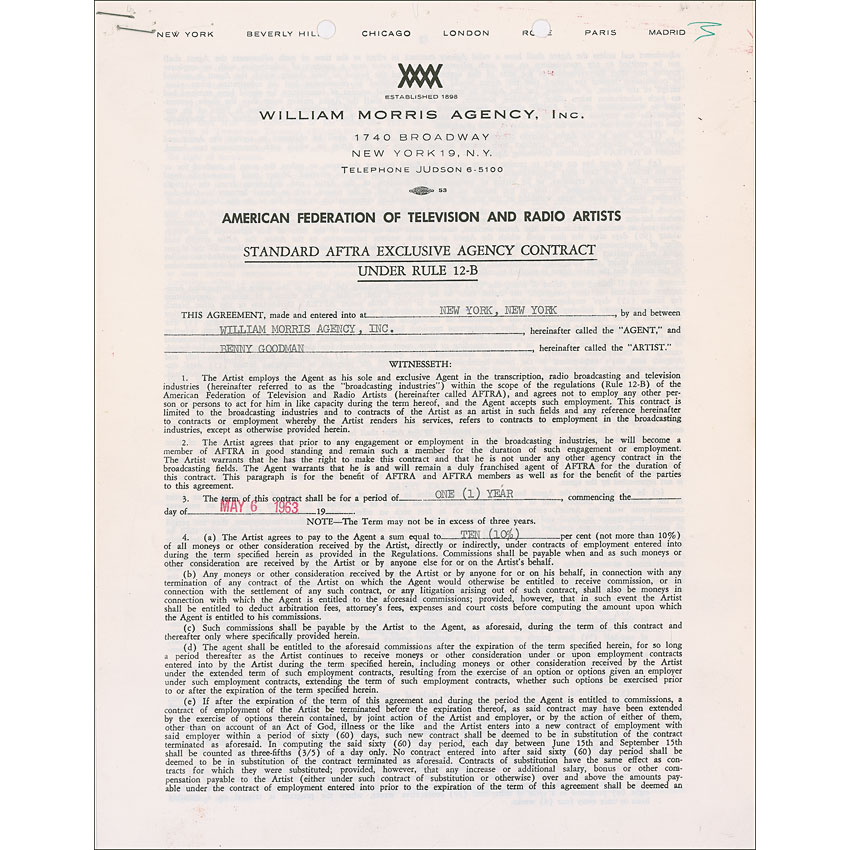 DS, two pages both sides, 8.5 x 11, May 6, 1963. Standard AFTRA Exclusive Agency Contract between Goodman and the William Morris Agency for a period of one year, in which Goodman agrees to pay the agency “10% of all moneys or other consideration received by the Artist.” The agency assigns Wallace Jordan, Sol Leon, Lou Weiss, and Harry Kalcheim to “personally supervise the Artist’s business during the term of the contract.” A few staple marks to the top left corner, a staple mark and small cut to the top edge between two punch holes, a few ink marks, and a date stamp slightly affecting the signature, otherwise fine condition. Pre-certified PSA/DNA and RR Auction COA.